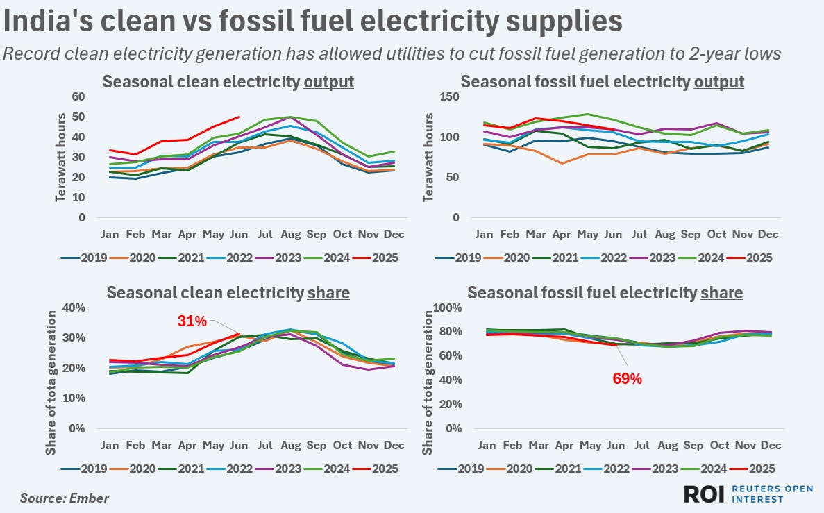 Figure 1. India’s clean electricity output has consistently risen over the past several years, with clean electricity making up an increasingly larger portion of its electricity generation.